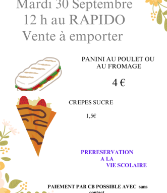 Par admin casteret, publié le lundi 22 septembre 2025 18:39 - Mis à jour le lundi 22 septembre 2025 18:39Les élèves du CAP Production Service Restauration vendront leurs produits en vente à emporter le mardi 30 septembre 2025 au RAPIDO du lycée. Préinscription à la vie scolaire. Paiement en CB possible. -
