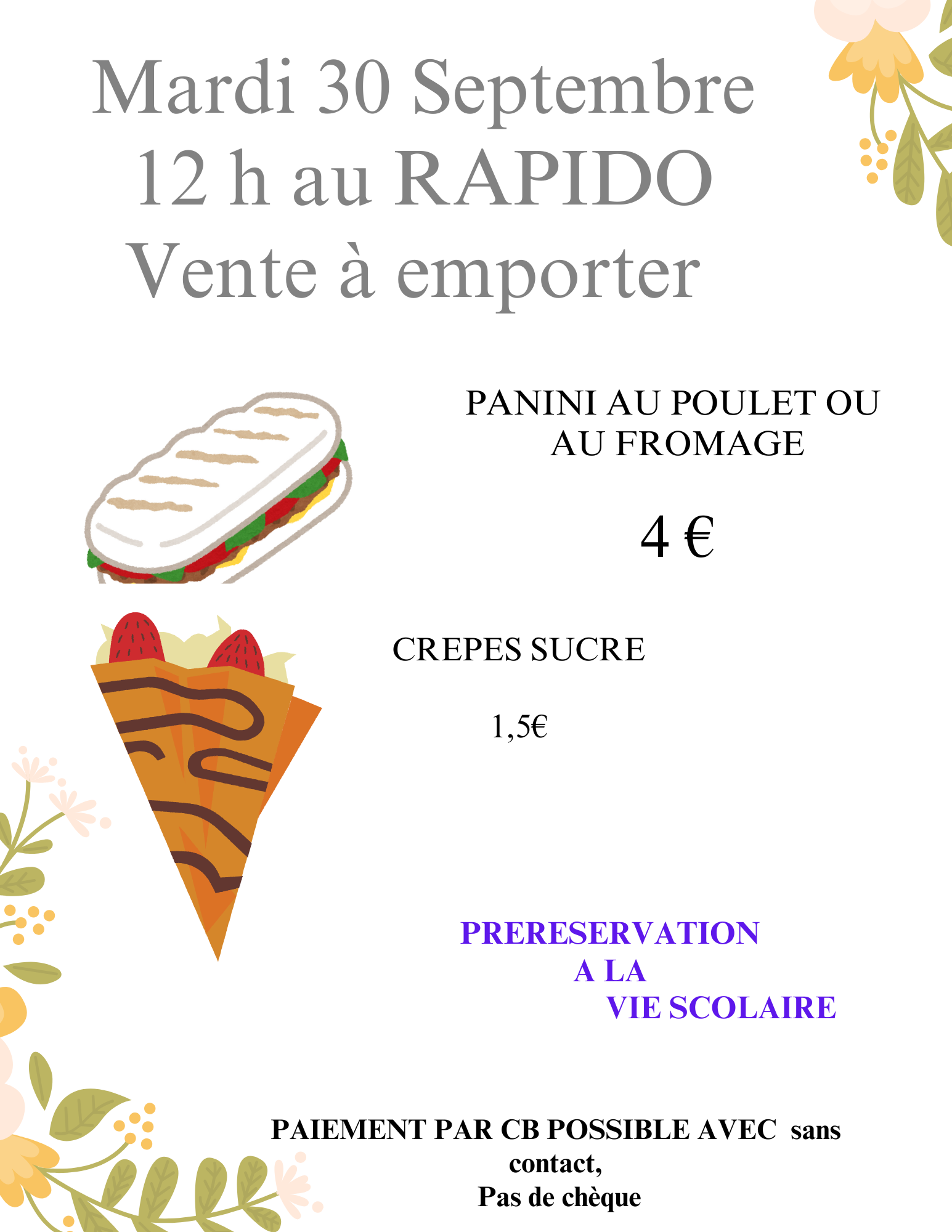 Les élèves du CAP Production Service Restauration vendront leurs produits en vente à emporter le mardi 30 septembre 2025 au RAPIDO du lycée. Préinscription à la vie scolaire. Paiement en CB possible.